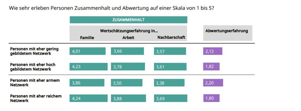 Sozio-ökonomische Netzwerkmerkmale erweisen sich für alltägliche Erfahrungen von Zusammenhalt, aber auch für Emotionen gegenüber gesellschaftlichen Gruppen als besonders relevant. In Arbeitswelt und Nachbarschaft machen Personen mit überwiegend armen Netzwerken weniger Zusammenhalts- und mehr Abwertungserfahrungen als Personen mit überwiegend wohlhabenden Netzwerken. Entsprechend präferieren Personen mit armen Netzwerken eine größere Gemeinschaftlichkeit in Familie und Nachbarschaft, während Personen mit reichen Netzwerken hier individuelle Ungebundenheit präferieren. Es zeigen sich auch weitere Unterschiede im Bereich von Werthaltungen und politischen Einstellungen: So neigen Personen mit reichen Netzwerken zu traditionalistischen Werthaltungen, während Personen mit armen Netzwerken dies weniger tun. Andererseits gibt es bei Personen mit armen (wie auch bei Personen mit gering gebildeten) Netzwerken eine größere Tendenz zu populistischen Orientierungen, während diese bei reichen (und hoch gebildeten) Netzwerken geringer ausgeprägt ist. Für Personen mit hochgebildeten Netzwerken finden sich weitere Zusammenhänge mit Werten und politischen Einstellungen, die jedoch nicht spiegelbildlich sind zu den Personen mit gering gebildeten Netzwerken. Sozio-ökonomische Netzwerkmerkmale fördern eine affektive Polarisierung entlang sozio-ökonomischer Spaltungslinien: Menschen mit überwiegend armen oder überwiegend reichen Bekannten machen beide stärkere emotionale Unterscheidungen in ihren Sympathiebewertungen zwischen reichen und armen Menschen als der Rest der Bevölkerung. Das Gleiche gilt für Netzwerke, die überwiegend aus Menschen mit einem niedrigen oder hohen Bildungsniveau bestehen: Beide haben positivere Gefühle gegenüber ihrer eigenen Gruppe und negativere Gefühle gegenüber der anderen.